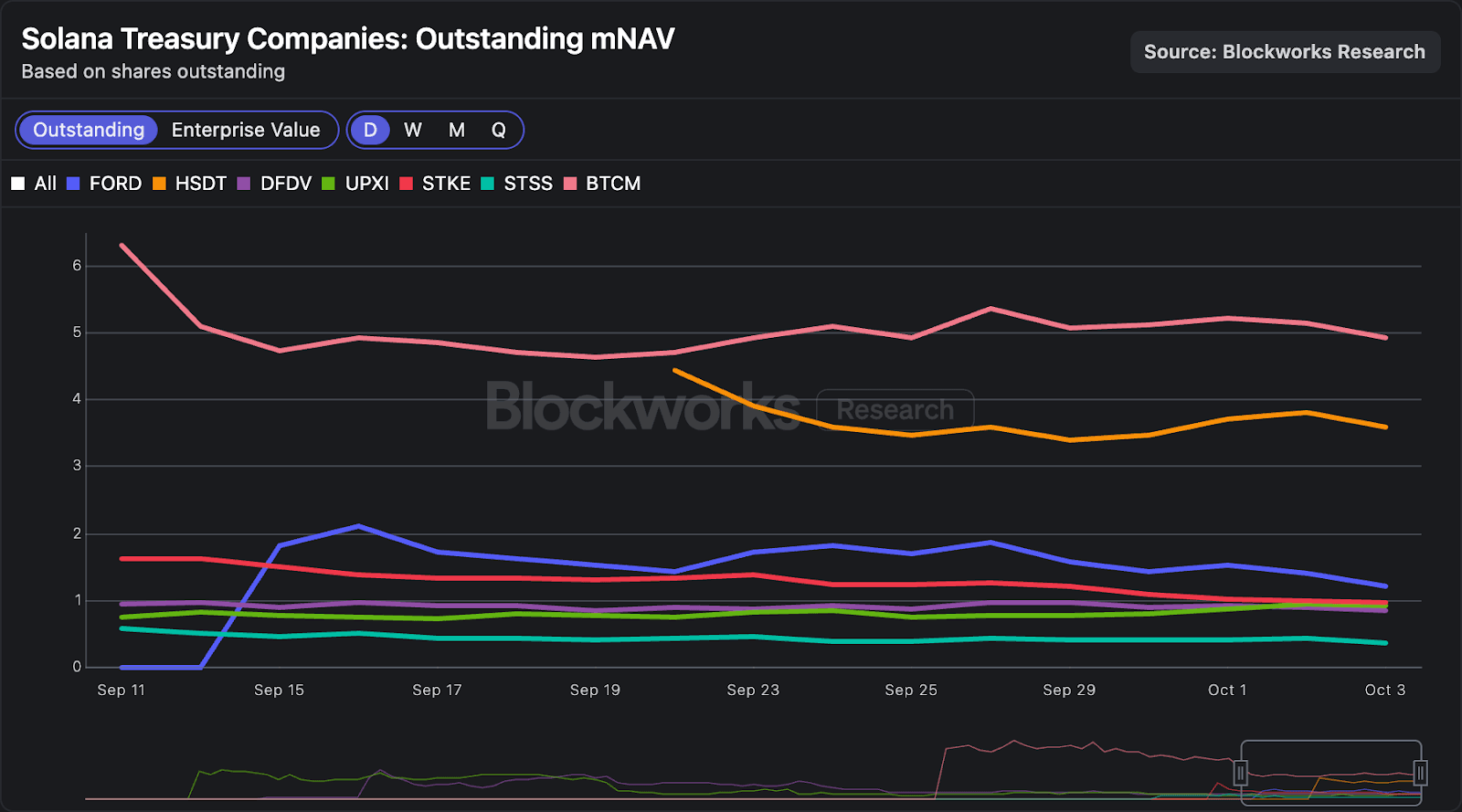 Forward Industries (FORD), Solana Company (HSDT) and Bit Mining (BTCM) remain the only three Solana DATs whose mNAVs continue to trade above 1.